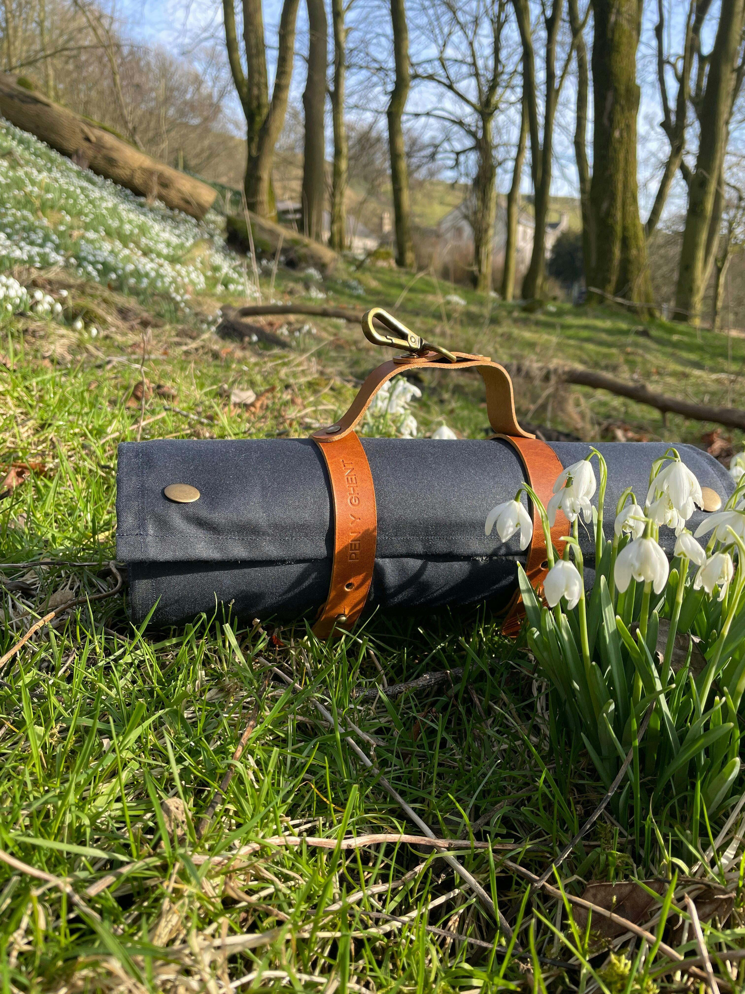 Small Batch Handmade Waxed Cotton and Sheepskin Mat with Leather Carrier.