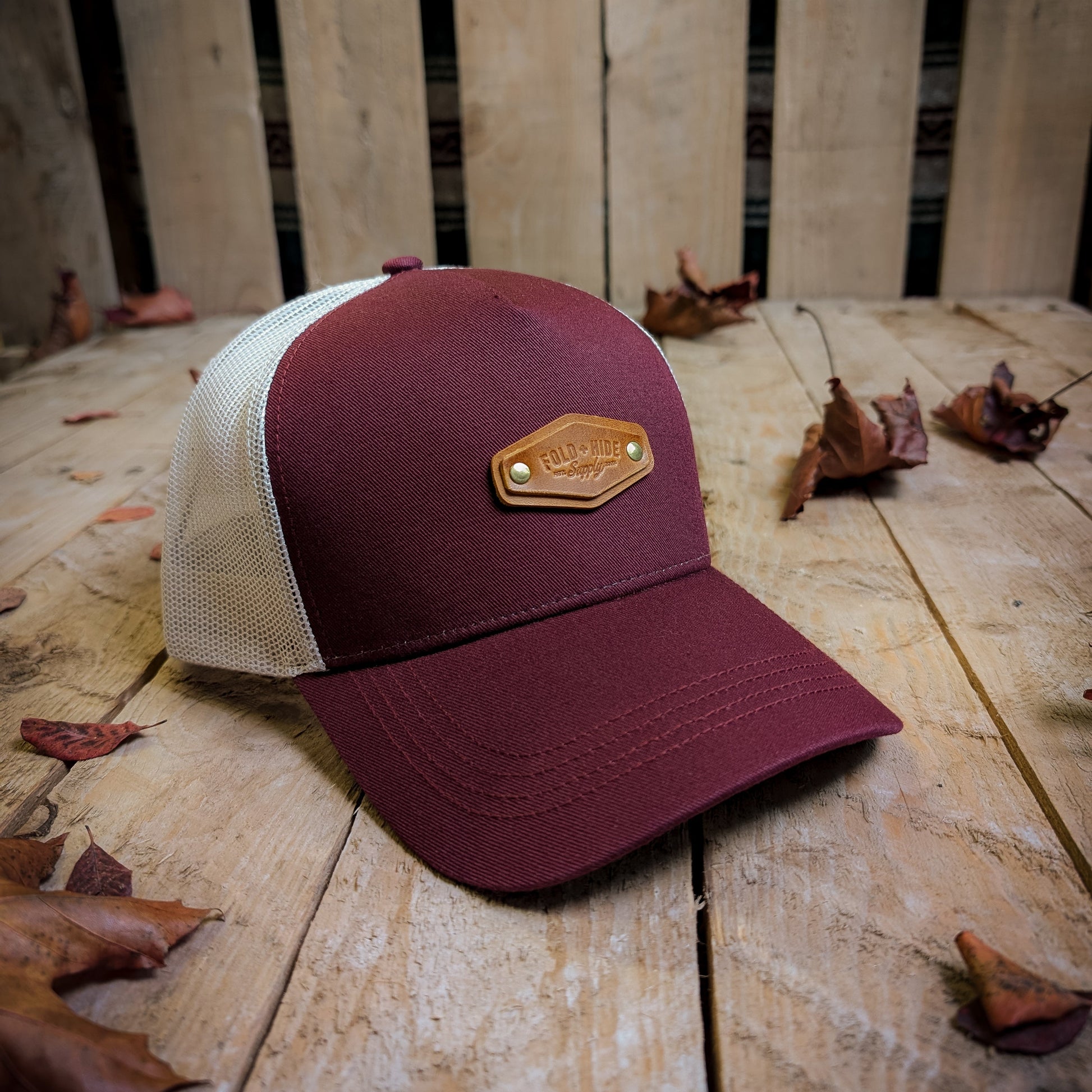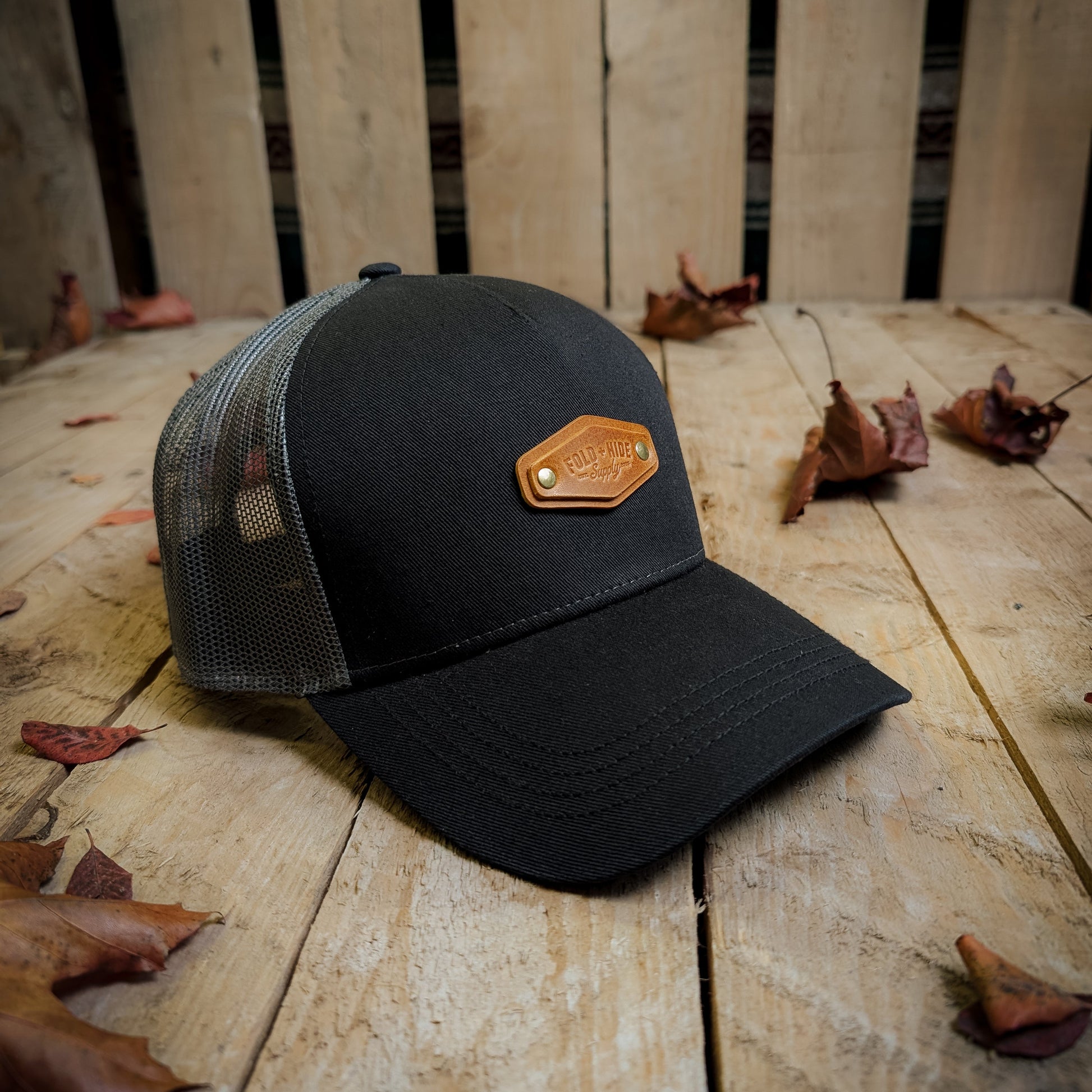 Each one is finished with my hand-embossed, double-layered leather label, riveted on in my workshop — a small detail that makes it unmistakably Fold and Hide.